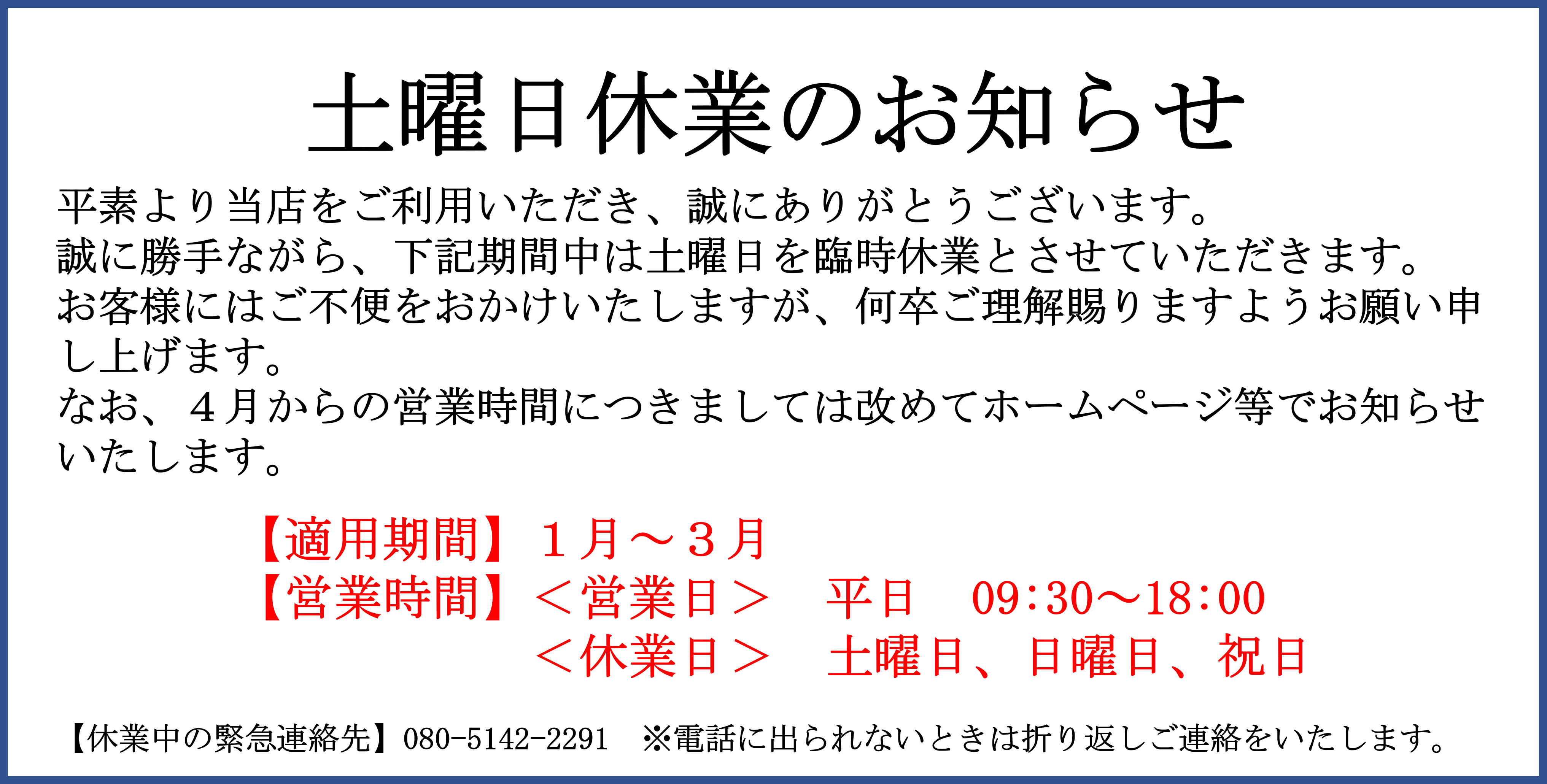 誠に勝手ながら、下記期間中は土曜日を臨時休業とさせていただきます。